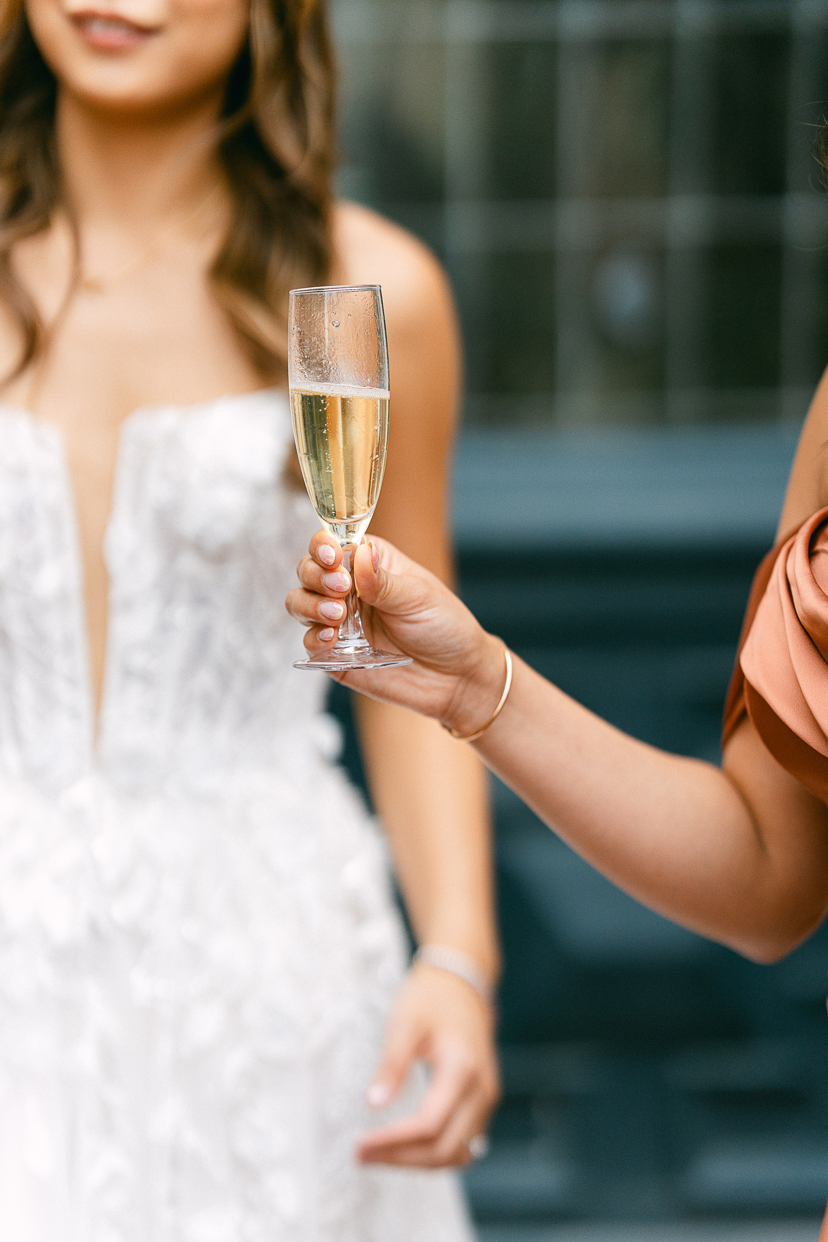 Après la cérémonie, les invités se retrouvent sous la verrière du Palais pour le cocktail. La lumière naturelle inonde l’espace, mettant en valeur l’architecture et les volumes du lieu.